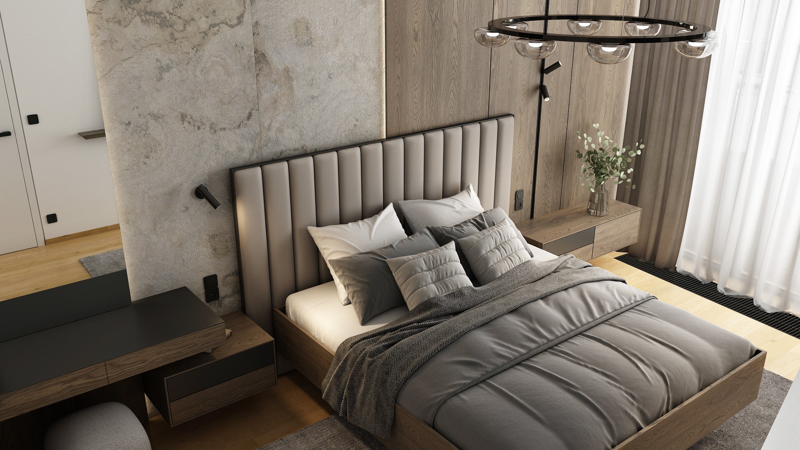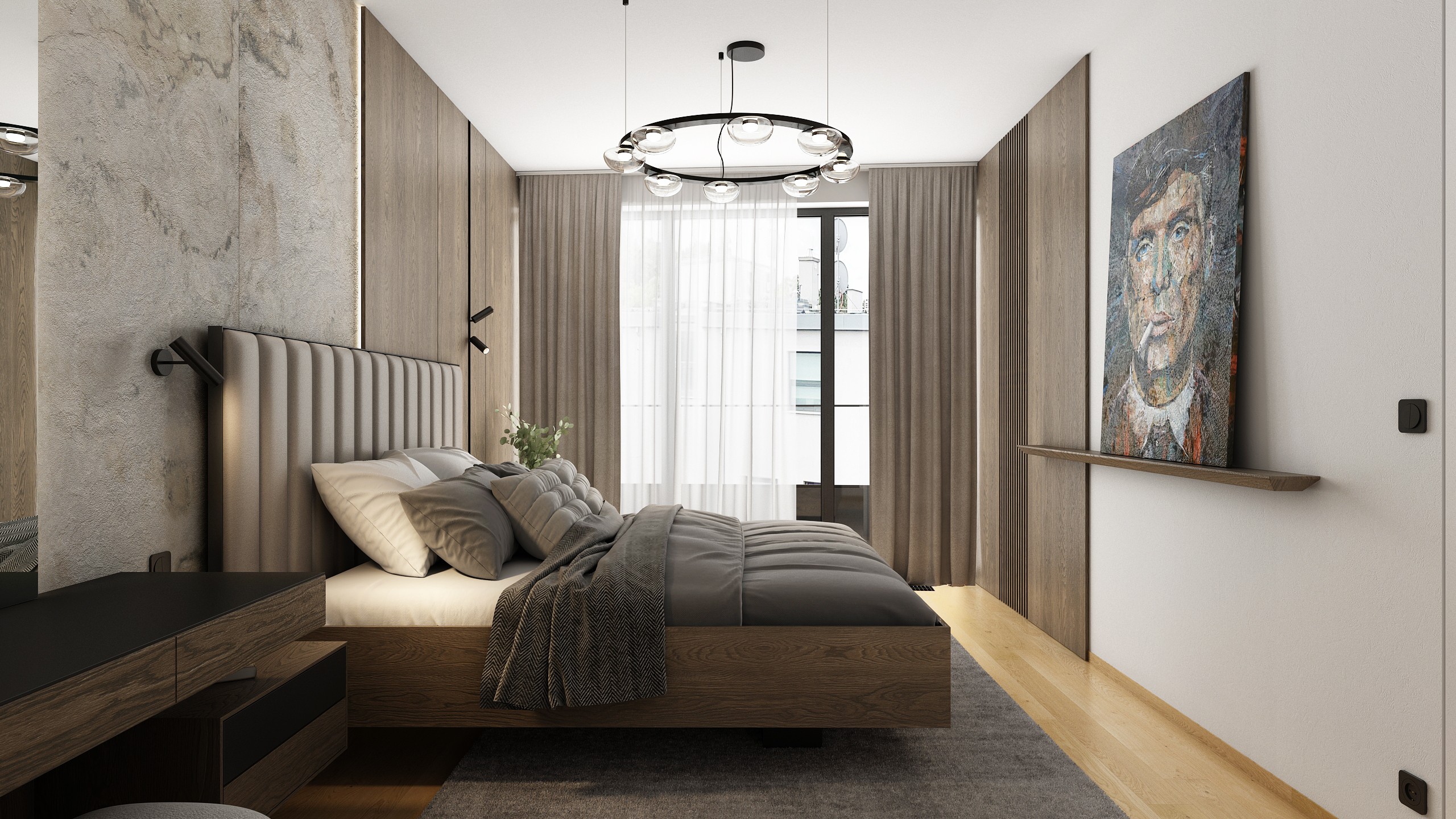 Pánská ložnice s čalouněnou postelí, jemnými texturami kůže a tmavým dřevem působí sofistikovaně a útulně. Promyšlené světlo, designové detaily a výrazné umělecké dílo dotvářejí harmonický prostor pro odpočinek.