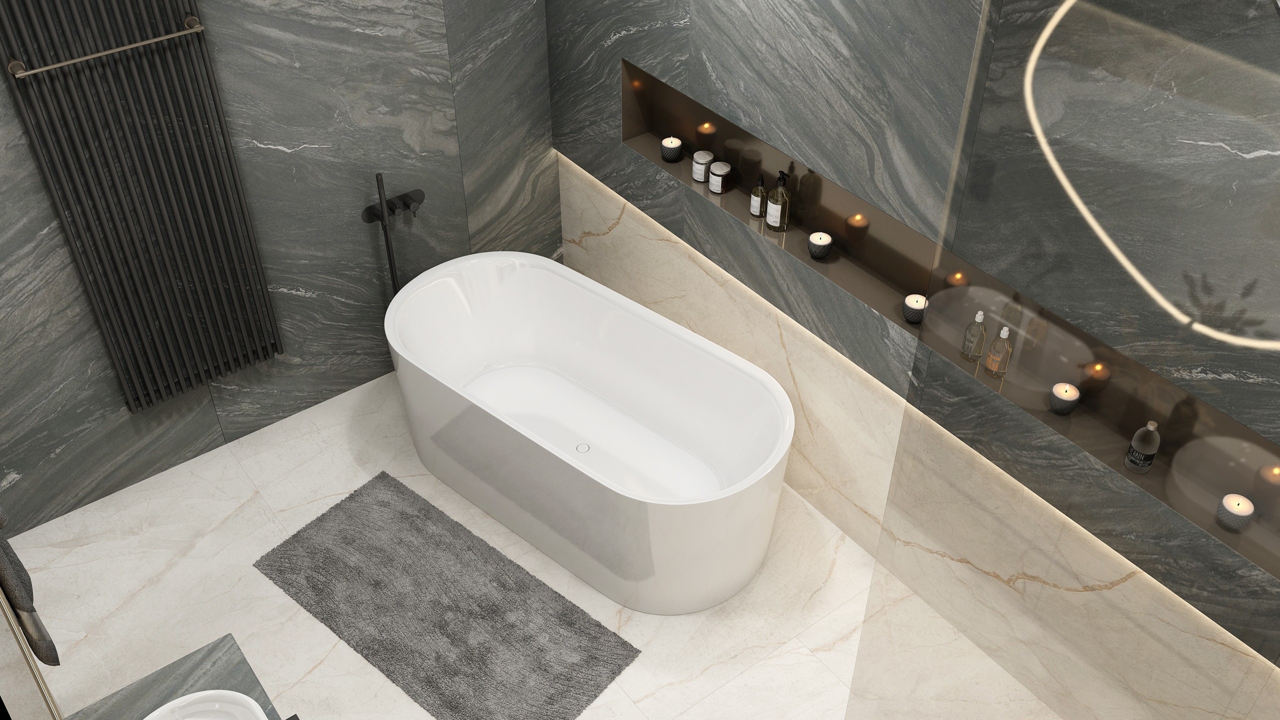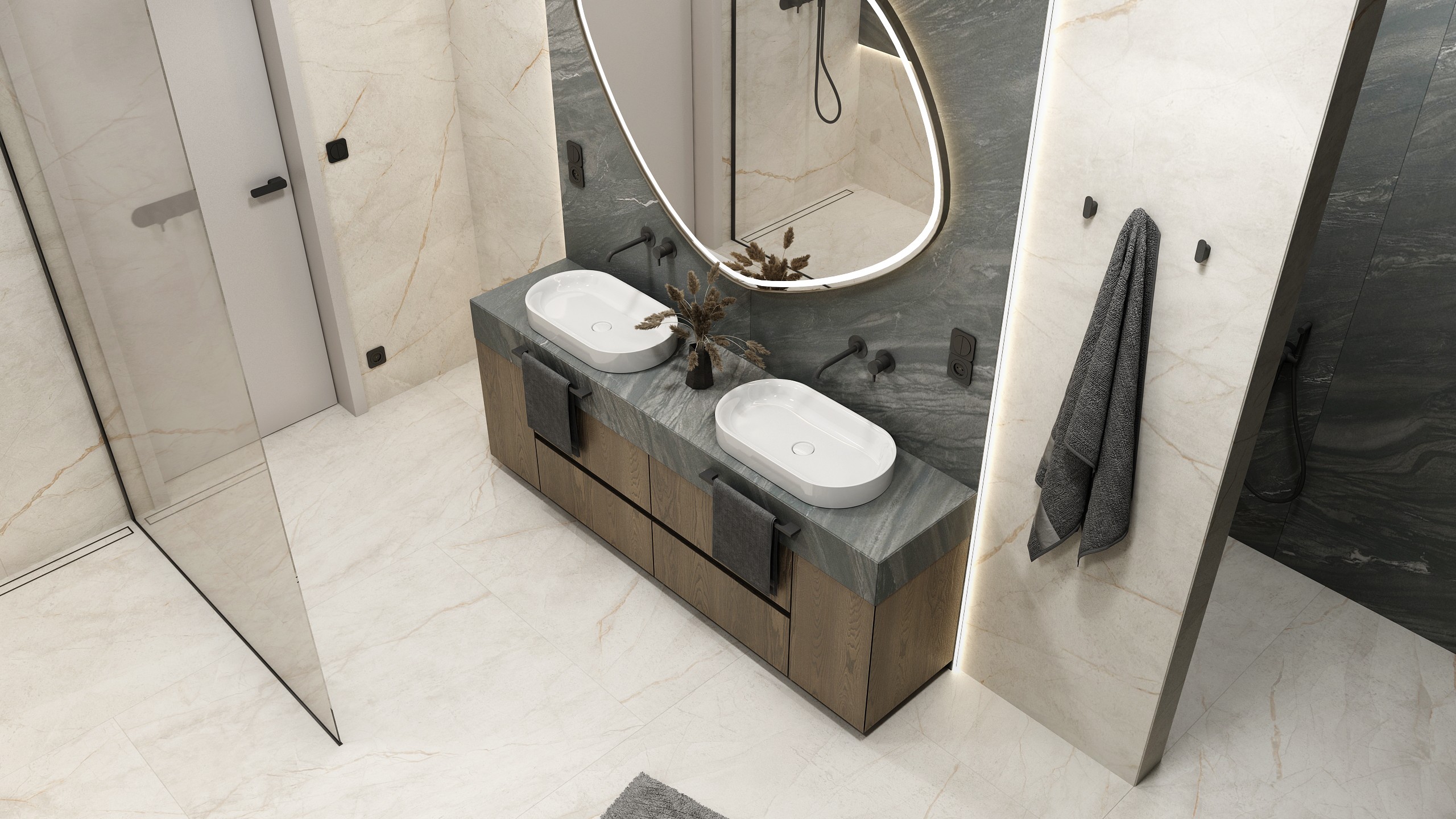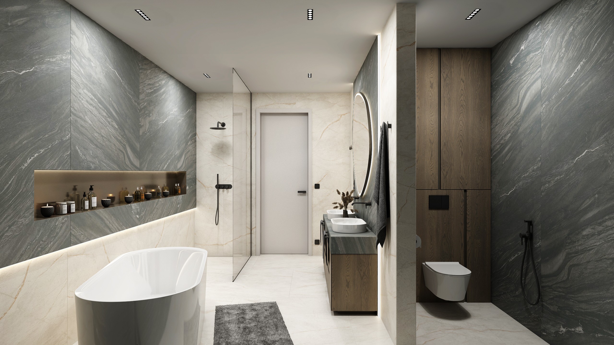 Soukromé útočiště, kde se spojuje funkčnost s luxusem. Volně stojící vana a kontrast světlého s tmavým přírodním kamenem dodávají noblesu, zatímco světlo a podsvícené niky tvoří intimní atmosféru. Dvojité umyvadlo a černé detaily podtrhují moderní eleganci.