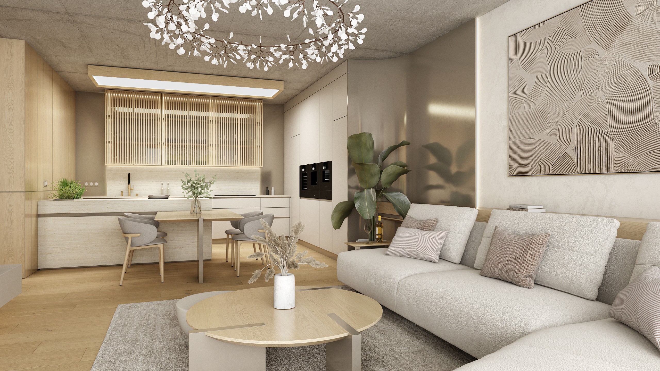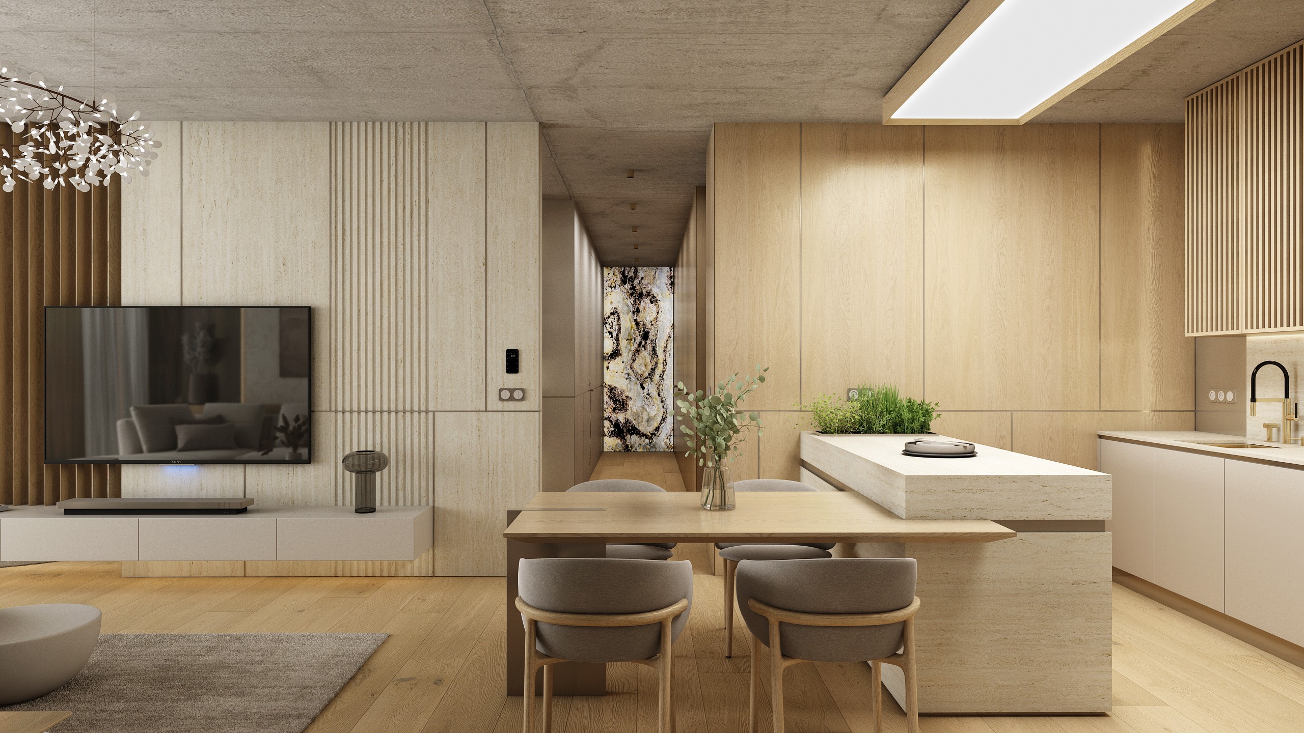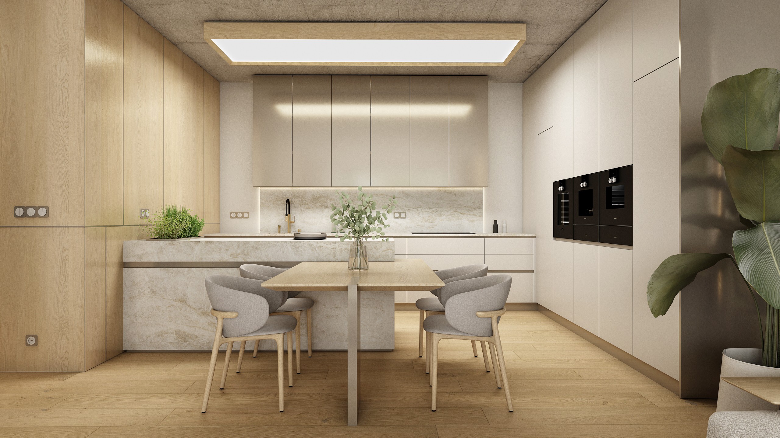 Nadstandardně vybavená kuchyně s poloostrůvkem a integrovaným jídelním stolem spojuje estetiku s praktičností. Přírodní kámen, dýha, kovové akcenty a litý beton vytvářejí premiové prostředí, kde se každodenní vaření stává zážitkem.