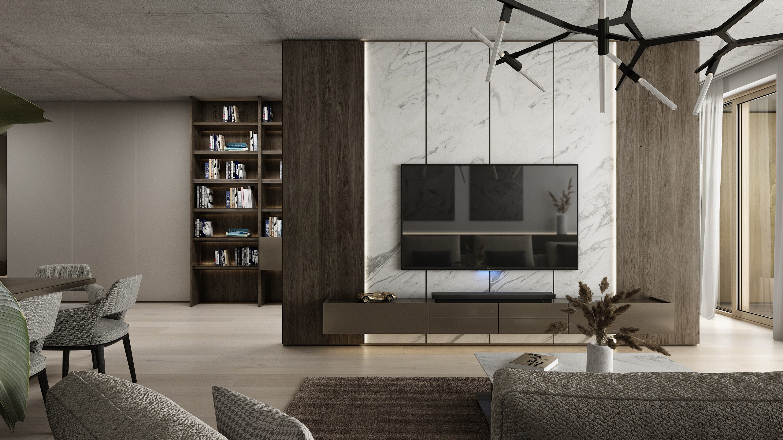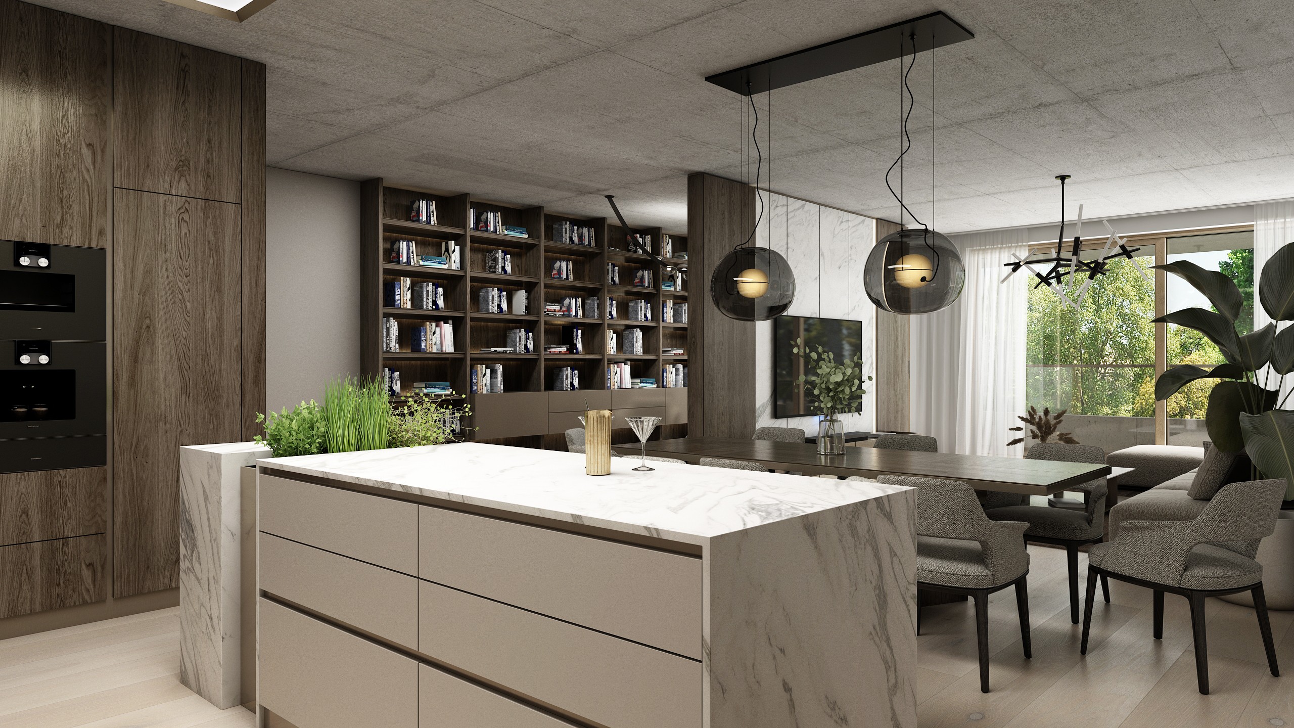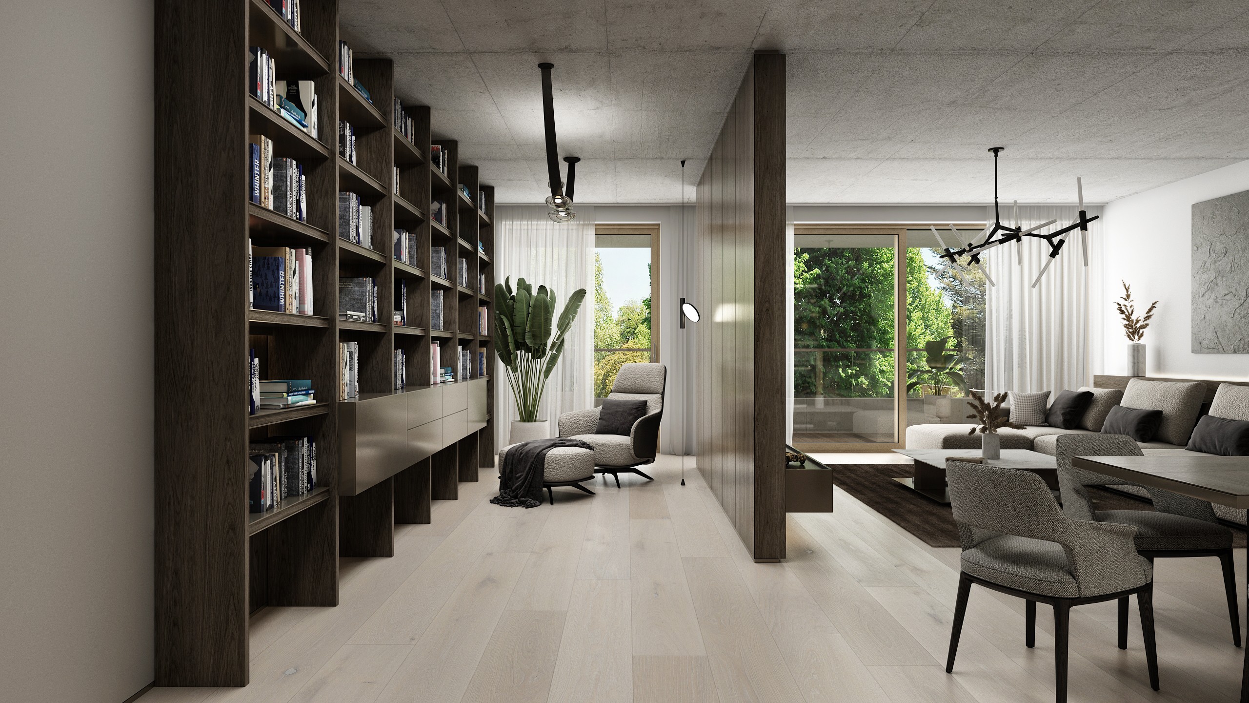 Velkorysý prostor s výškou 3 m kombinuje litý betonový strop, mořenou dýhu a kovové detaily. Dominantní knihovna tvoří funkční i estetický prvek, který podtrhuje luxusní a sebevědomý charakter interiéru.